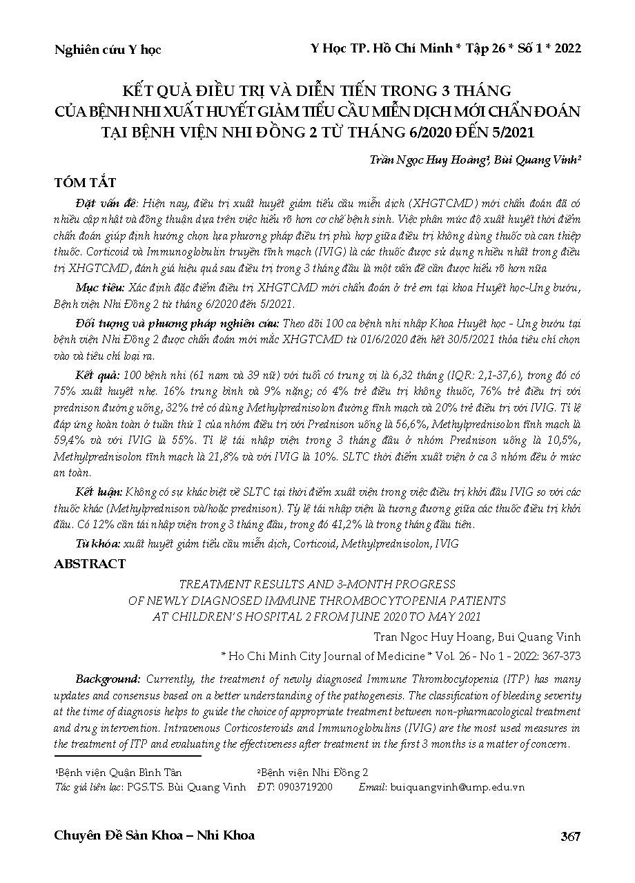 Kết quả điều trị và diễn tiến trong 3 tháng của bệnh nhi xuất huyết giảm tiểu cầu miễn dịch mới chẩn đoán tại Bệnh viện Nhi đồng 2 từ tháng 6/2020 đến 5/2021
