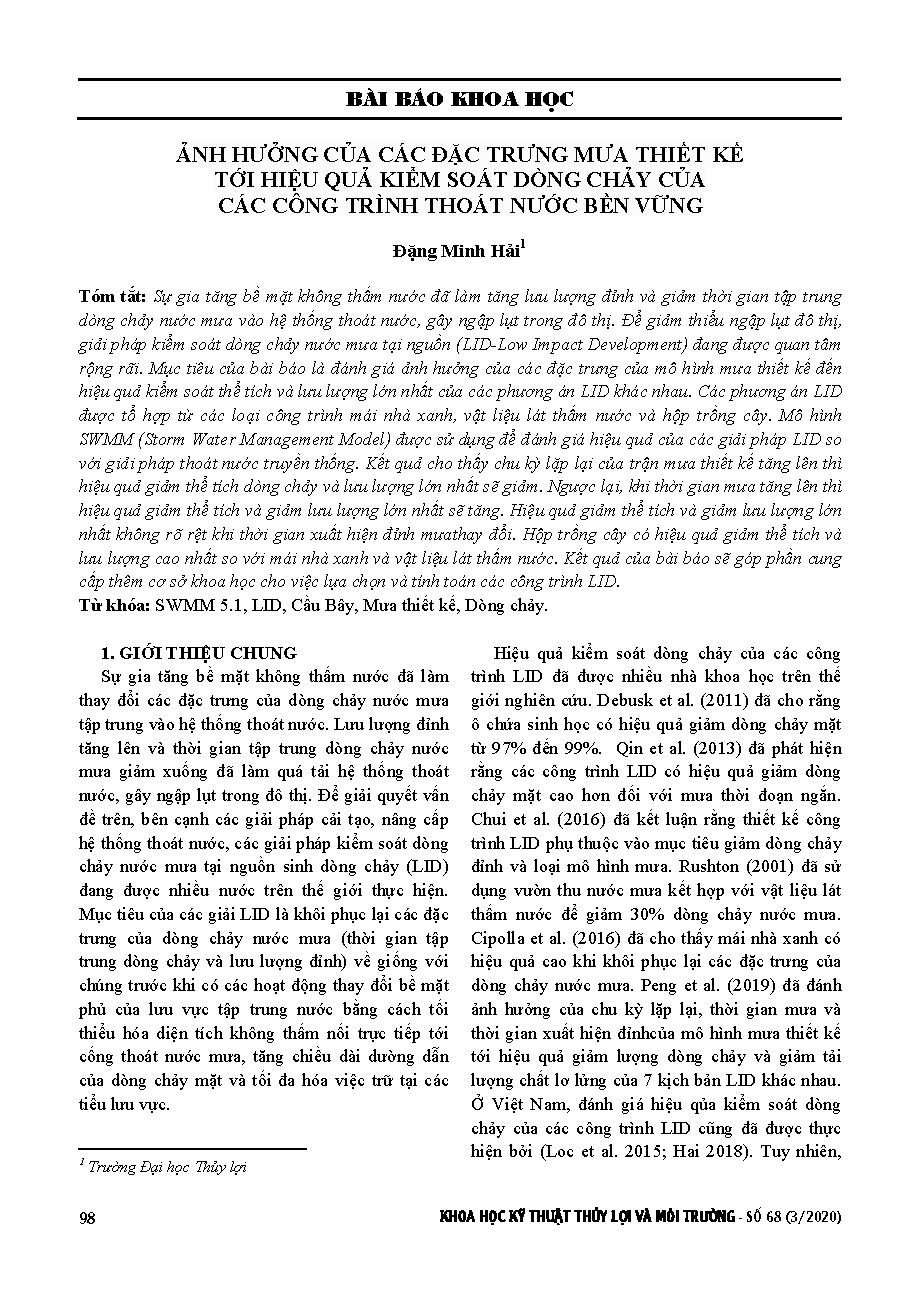 Ảnh hưởng của các đặc trưng mưa thiết kế tới hiệu quả kiểm soát dòng chảy của các công trình thoát nước bền vững = The effect of design storm characteristics on low-impact developmentpractices for rainfall run off control