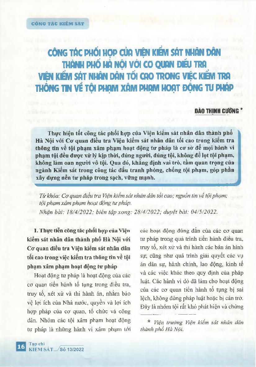 Công tác phối hợp của Viện kiểm sát nhân dân thành phố Hà Nội với Cơ quan điều tra Viện kiểm sát nhân dân tối cao trong việc kiểm tra thông tin về tội phạm xâm phạm hoạt động tư pháp = Cooperation of the People’s Procuracy of Hanoi with the Investigation