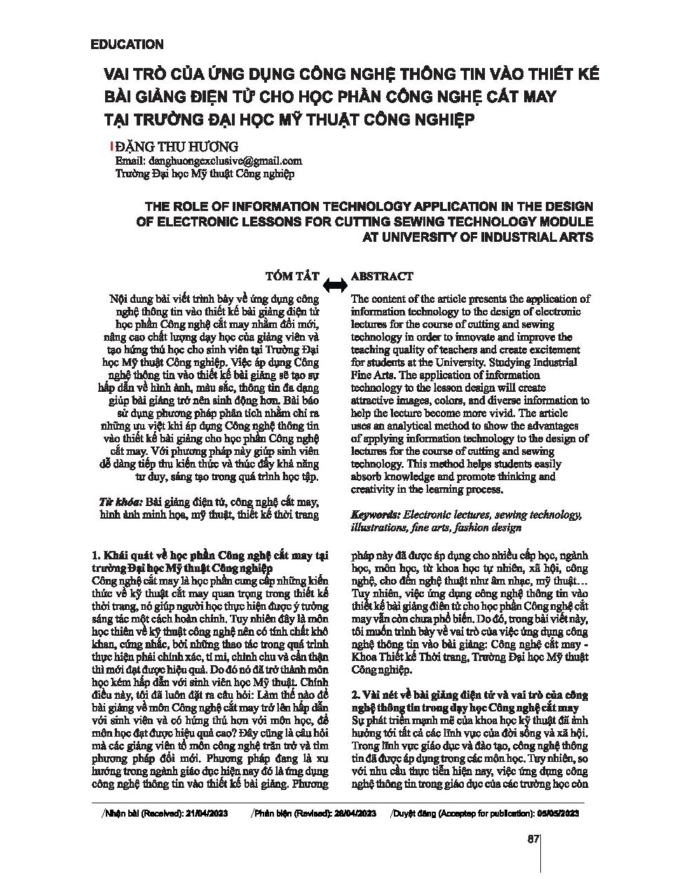 Vai trò của ứng dụng công nghệ thông tin vào thiết kế bài giảng điện tử cho học phần công nghệ cắt may tại trường Đại học Mỹ thuật Công nghiệp