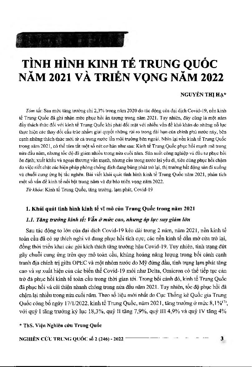Tình hình kinh tế Trung Quốc năm 2021 và triển vọng năm 2022 = China’s economic situation in 2021 and outlook for 2022