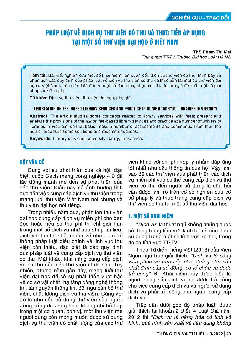 Pháp luật về dịch vụ thư viện có thu và thực tiễn áp dụng tại một số thư viện đại học ở Việt Nam = Legislation on fee-based library services and practice in some academic libraries in Vietnam
