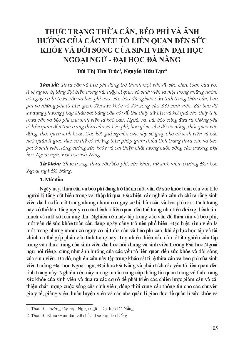 Thực trạng thừa cân, béo phì và ảnh hưởng của các yếu tố liên quan đến sức khỏe và đời sống của sinh viên Đại học Ngoại ngữ - Đại học Đà Nẵng = The status of overweight and obesity and the influence of related factors on health and life of students at the