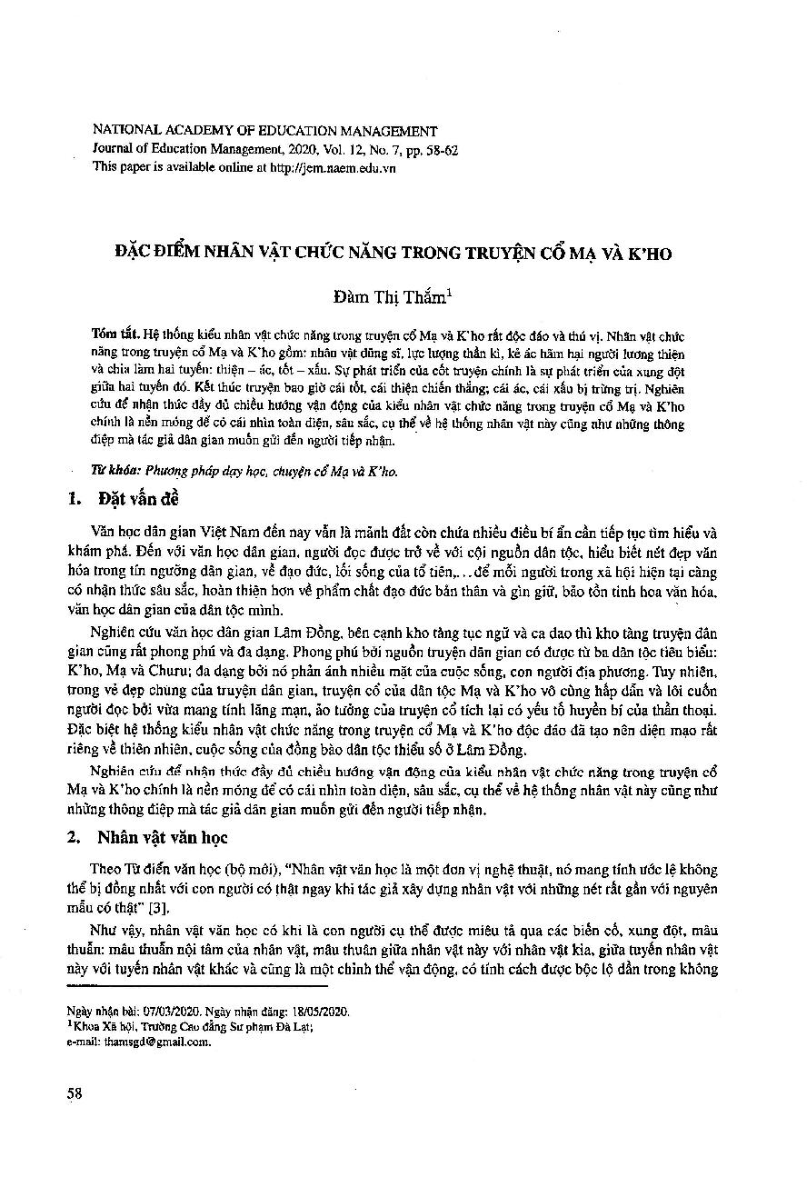 Đặc điểm nhân vật chức năng trong truyện cổ Mạ và K’ho = Characteristics of functional characteristics in the legend Ma and K’ho