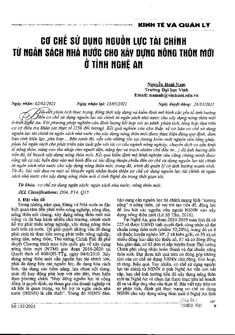 Cơ chế sử dụng nguồn lực tài chính từ ngân sách nhà nước cho xây dựng nông thôn mới ở tỉnh Nghệ An = Mechanism of Using Financial Resources from the State Budget for New Rural Construction in Nghe An Province