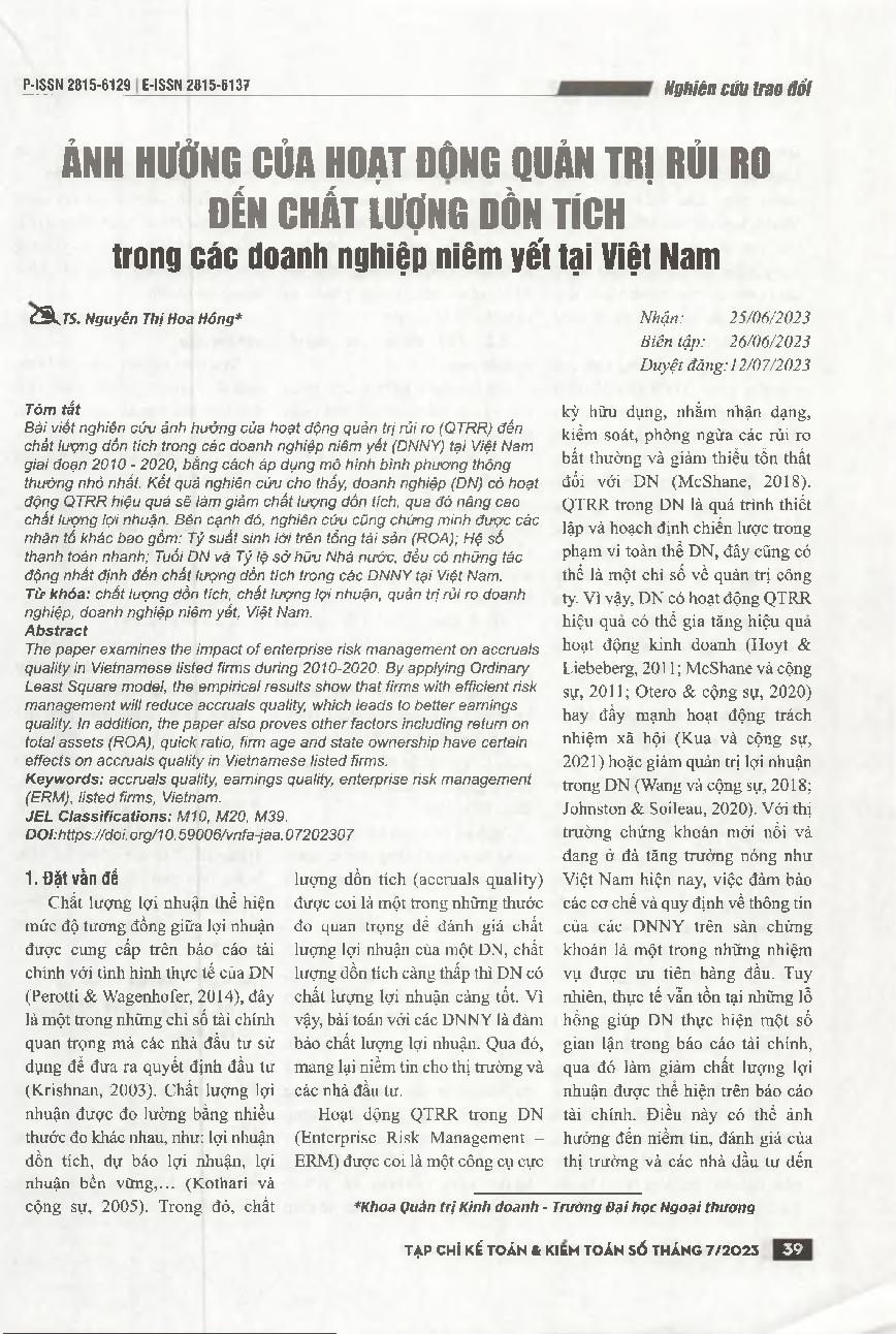 Ảnh hưởng của hoạt động quản trị rủi ro đến chất lượng dồn tích trong các doanh nghiệp niêm yết tại Việt Nam