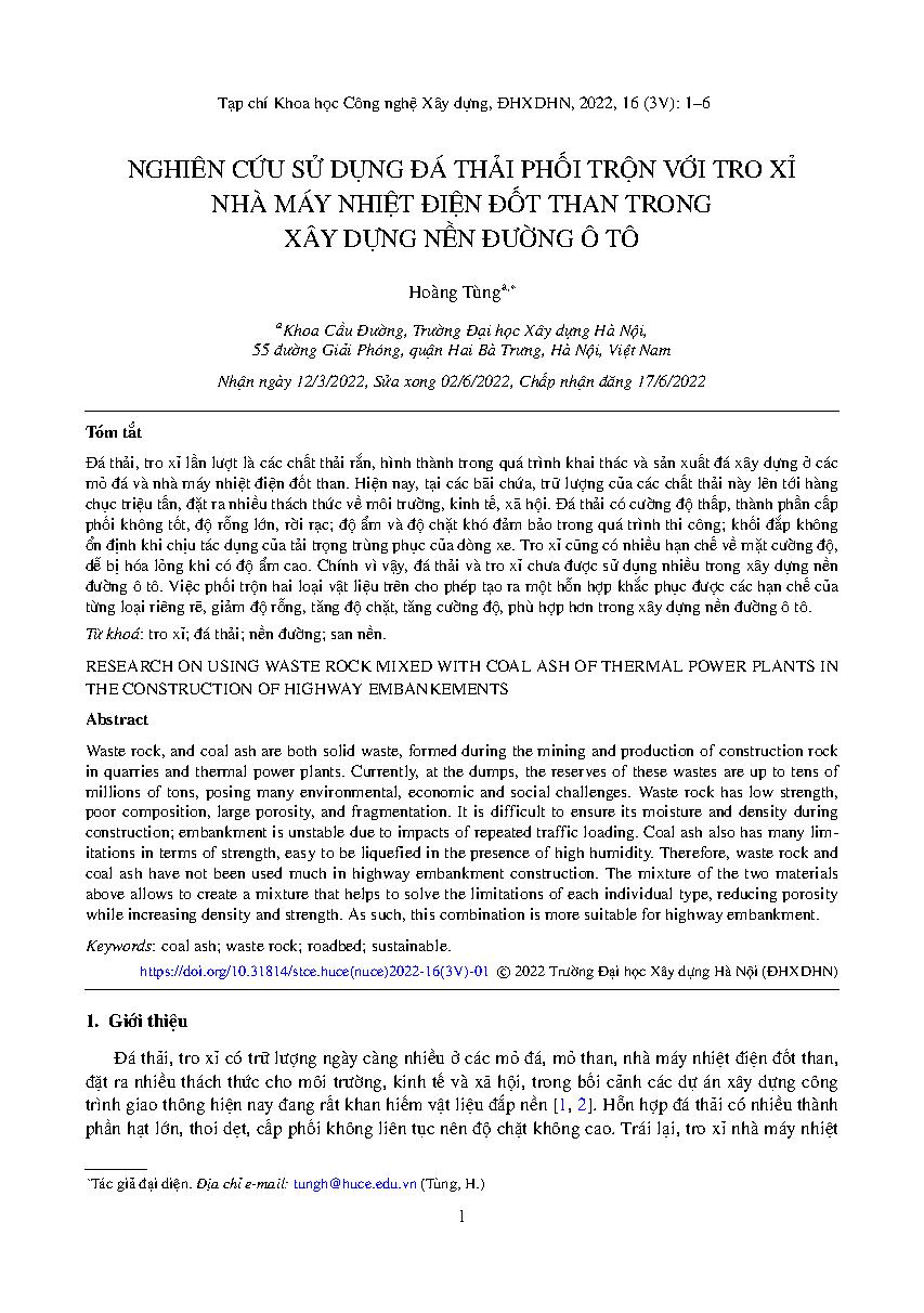 Nghiên cứu sử dụng đá thải phối trộn với tro xỉ nhà máy nhiệt điện đốt than trong xây dựng nền đường ô tô = Research on using waste rock mixed with coal ash of thermal power plants in the construction of highway embankements