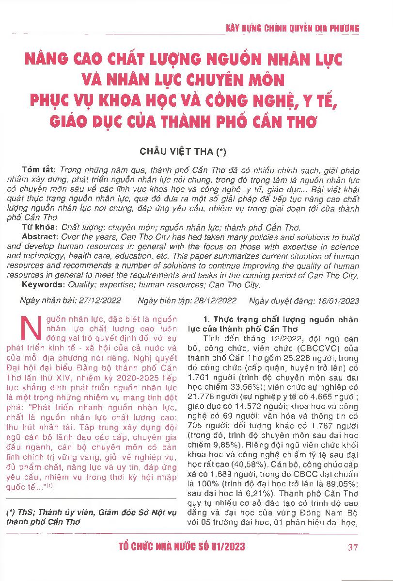 Nâng cao chất lượng nguồn nhân lực và nhân lực chuyên môn phục vụ khoa học và công nghệ, y tế, giáo dục của thành phố Cần Thơ = Improving the quality of human resources and 37 professional personnel for science and technology, health and education sectors
