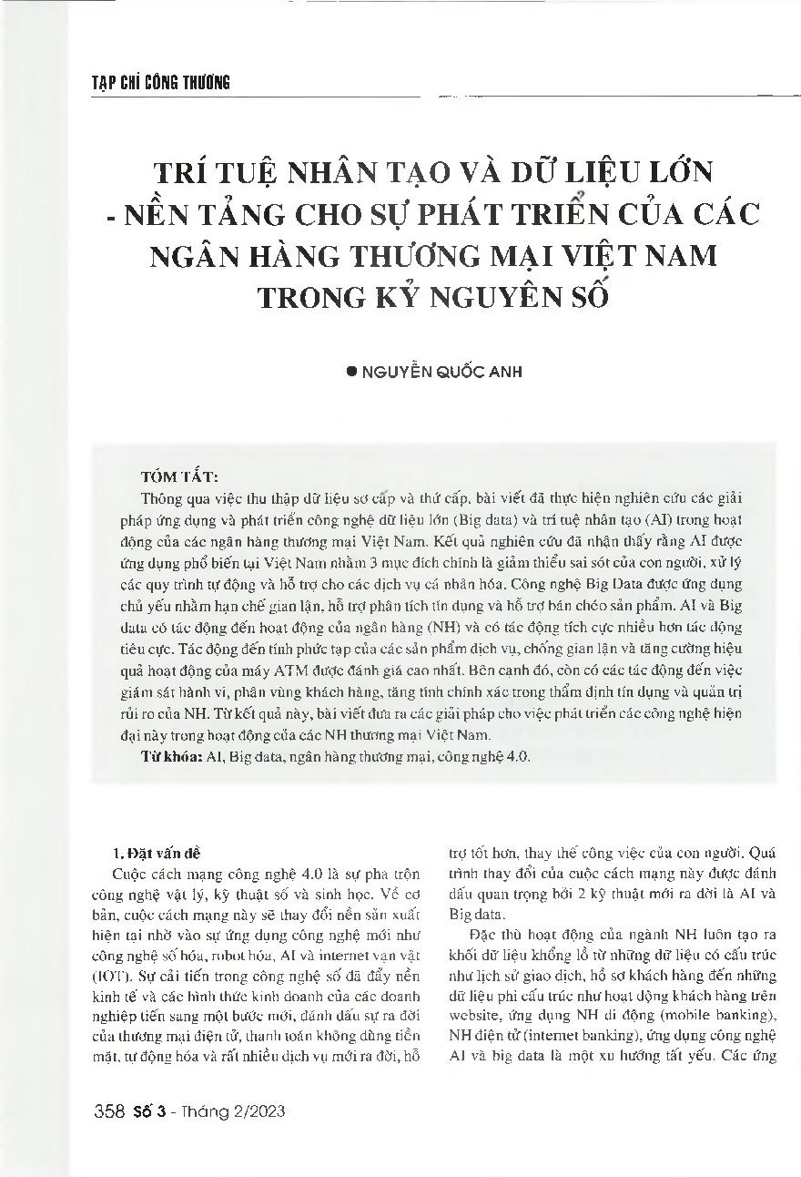 Trí tuệ nhân tạo và dữ liệu lớn - Nền tảng cho sự phát triển của các ngân hàng thương mại Việt Nam trong kỷ nguyên số = Big Data and artificial intelligence- The foundation for the development of Vietnamese commercial banks in the digital era