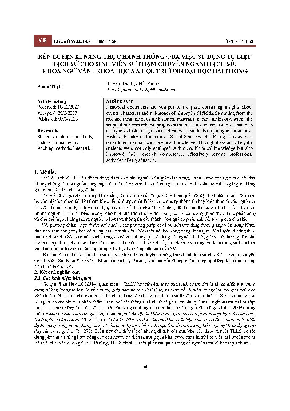 Rèn luyện kĩ năng thực hành thông qua việc sử dụng tư liệu lịch sử cho sinh viên Sư phạm chuyên ngành Lịch sử, khoa Ngữ văn - Khoa học xã hội, Trường Đại học Hải Phòng = Practicing practical skills through the use of historical materials for Pedagogical s