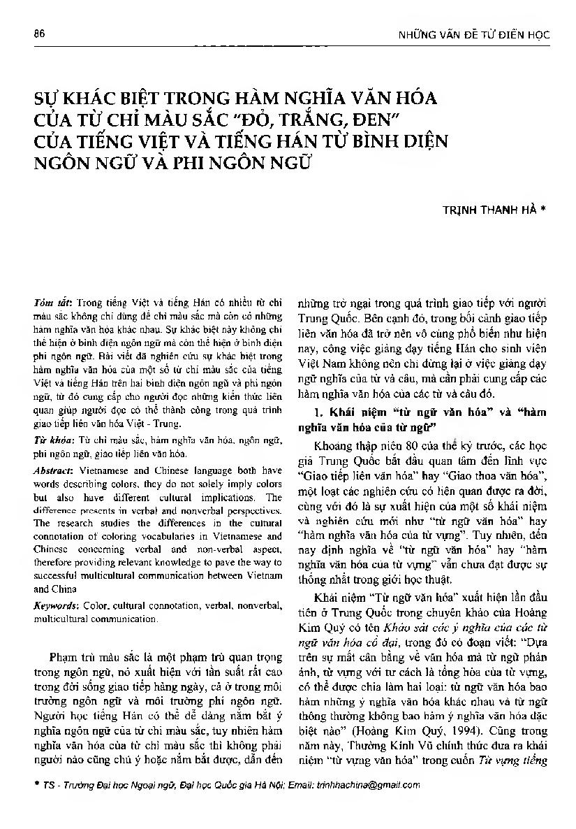 Sự khác biệt trong hàm nghĩa văn hóa của từ chỉ màu sắc “đỏ, trắng, đen” của tiếng Việt và tiếng Hán từ bình diện ngôn ngữ và phi ngôn ngữ = The differences in cultural connotation of words referring to colours including red, white, and black in Vietnamese and Chinese from verbal and non-verbal perspectives