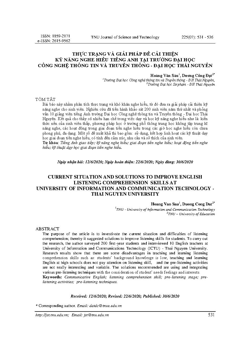 THỰC TRẠNG VÀ GIẢI PHÁP ĐỂ CẢI THIỆN KỸ NĂNG NGHE HIỂU TIẾNG ANH TẠI TRƯỜNG ĐẠI HỌC CÔNG NGHỆ THÔNG TIN VÀ TRUYỀN THÔNG - ĐẠI HỌC THÁI NGUYÊN = CURRENT SITUATION AND SOLUTIONS TO IMPROVE ENGLISH LISTENING COMPREHENSION SKILLS AT UNIVERSITY OF INFORMATION AND COMMUNICATION TECHNOLOGY - THAI NGUYEN UNIVERSITY