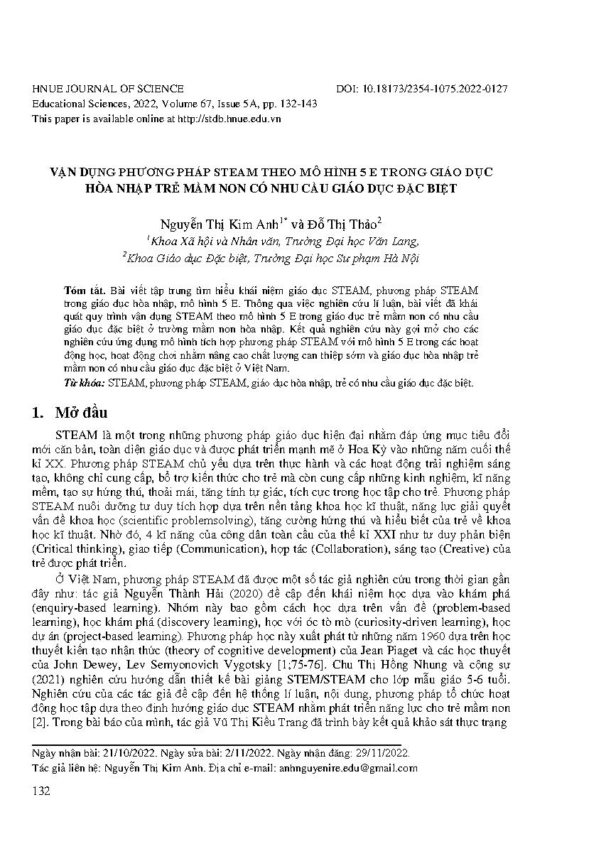 Vận dụng phương pháp steam theo mô hình 5 e trong giáo dục hòa nhập trẻ mầm non có nhu cầu giáo dục đặc biệt = Applying STEAM method according to 5E MODEL IN inclusive education for preschool children with special needs