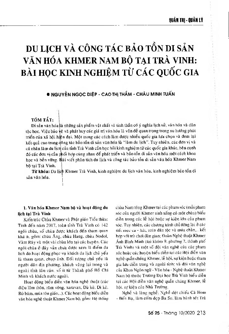 Du lịch và công tác bảo tồn di sản văn hóa Khmer Nam bộ tại Trà Vinh: Bài hoc kinh nghiêm từ các quốc gia = Tourism and the conservation of Khmer's cultural heritages in Tra Vinh Province: Lessons from international experience