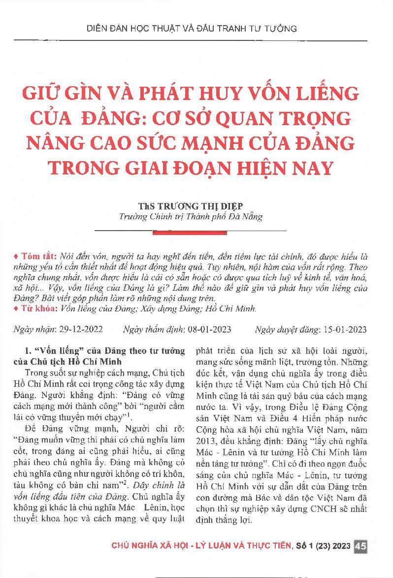 Giữ gìn và phát huy vốn liếng của Đảng: Cơ sở quan trọng nâng cao sức mạnh của Đảng trong giai đoạn hiện nay = Preserving and promoting the Party's capital: The important foundation to enhance the Party's strength in the current period