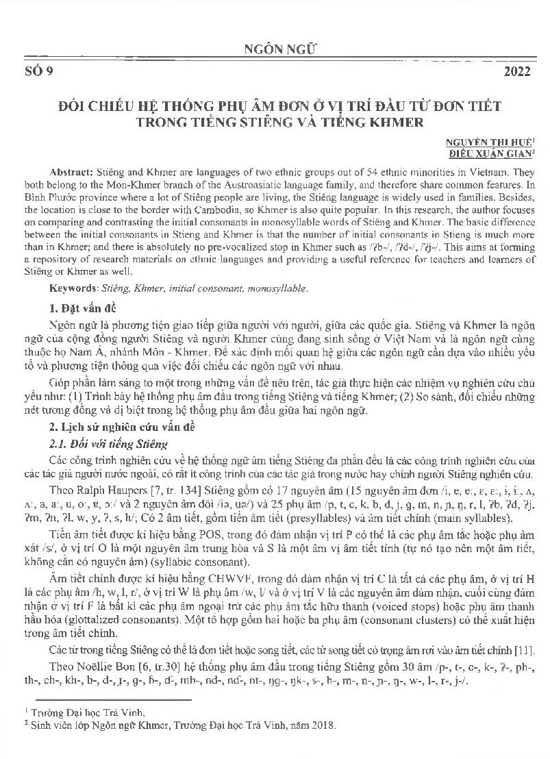 Đối chiếu hệ thống phụ âm đơn ở vị trí đầu từ đơn tiết trong tiếng Stiêng và tiếng Khmer = Contrasting initial consonants in monosyllabic words in Stiêng and Khmer languages