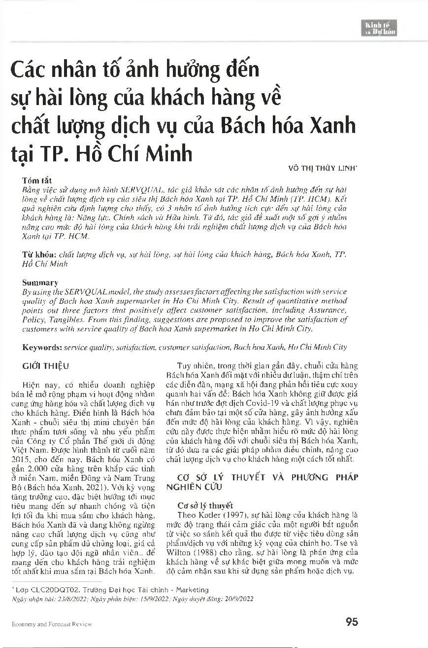 Các nhân tố ảnh hưởng đến sự hài lòng của khách hàng về chất lượng dịch vụ của Bách hóa Xanh tại TP. Hồ Chí Minh = Determinants of customer satisfaction with service quality of Bach Hoa Xanh in Ho Chi Minh City
