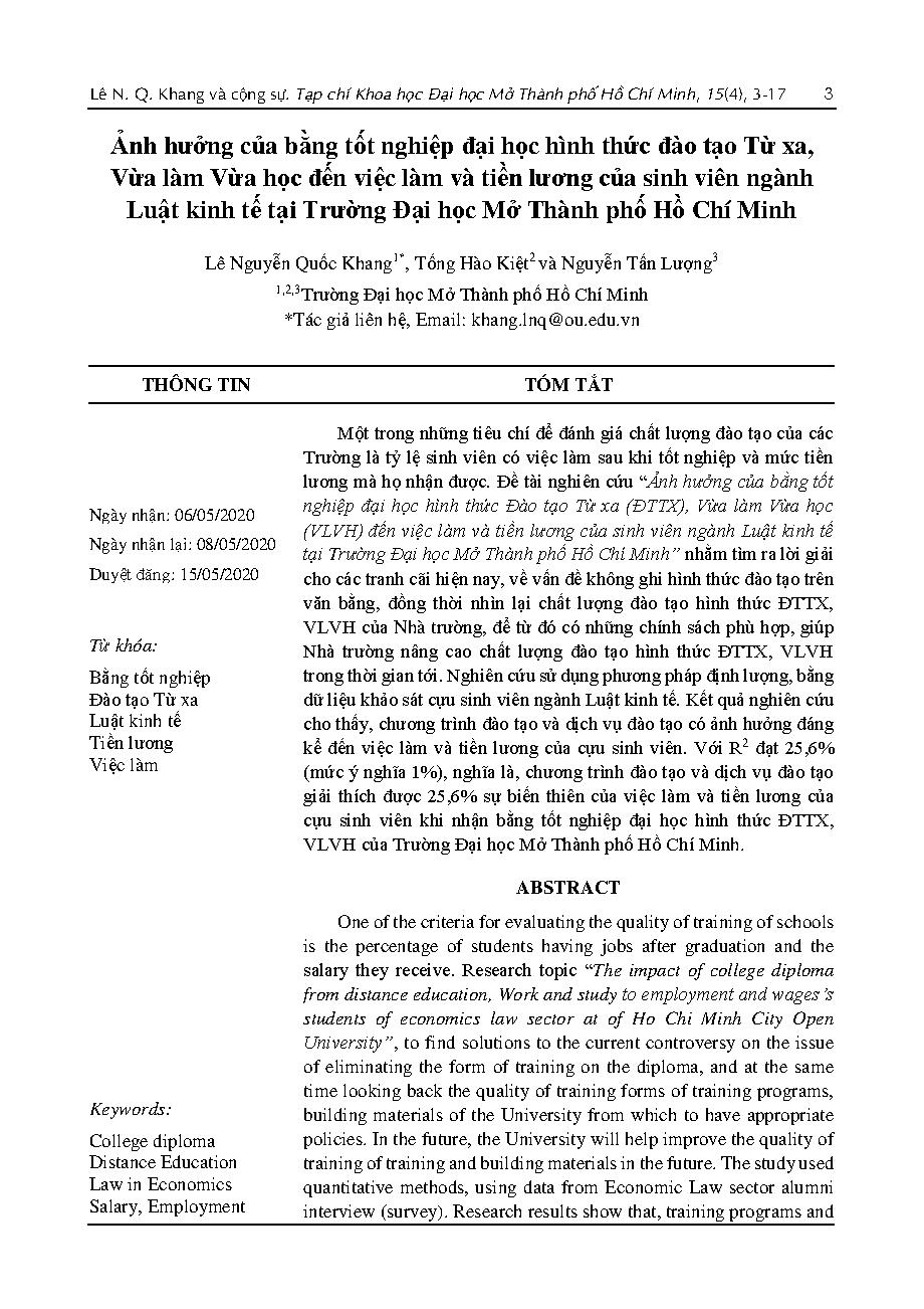 Ảnh hưởng của bằng tốt nghiệp đại học hình thức đào tạo từ xa, vừa làm vừa học đến việc làm và tiền lương của sinh viên ngành Luật kinh tế tại Trường Đại học Mở Thành phố Hồ Chí Minh = Influence of university diploma in the form of distance education, work while studying on employment and salaries of students in Economic Law at the Open University of Ho Chi Minh City