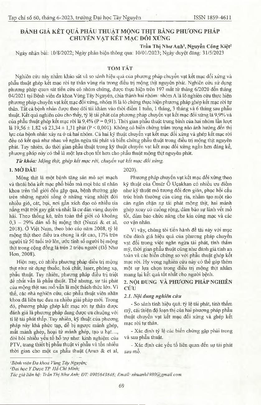 Đánh giá kết quả phẫu thuật mộng thịt bằng phương pháp chuyển vạt kết mạc đối xứng