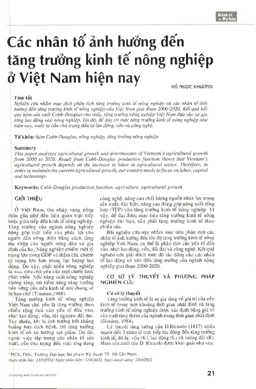 Các nhân tố ảnh hưởng đến tăng trưởng kinh tế nông nghiệp ở Việt Nam hiện nay = Determinants of agricultural growth in Vietnam