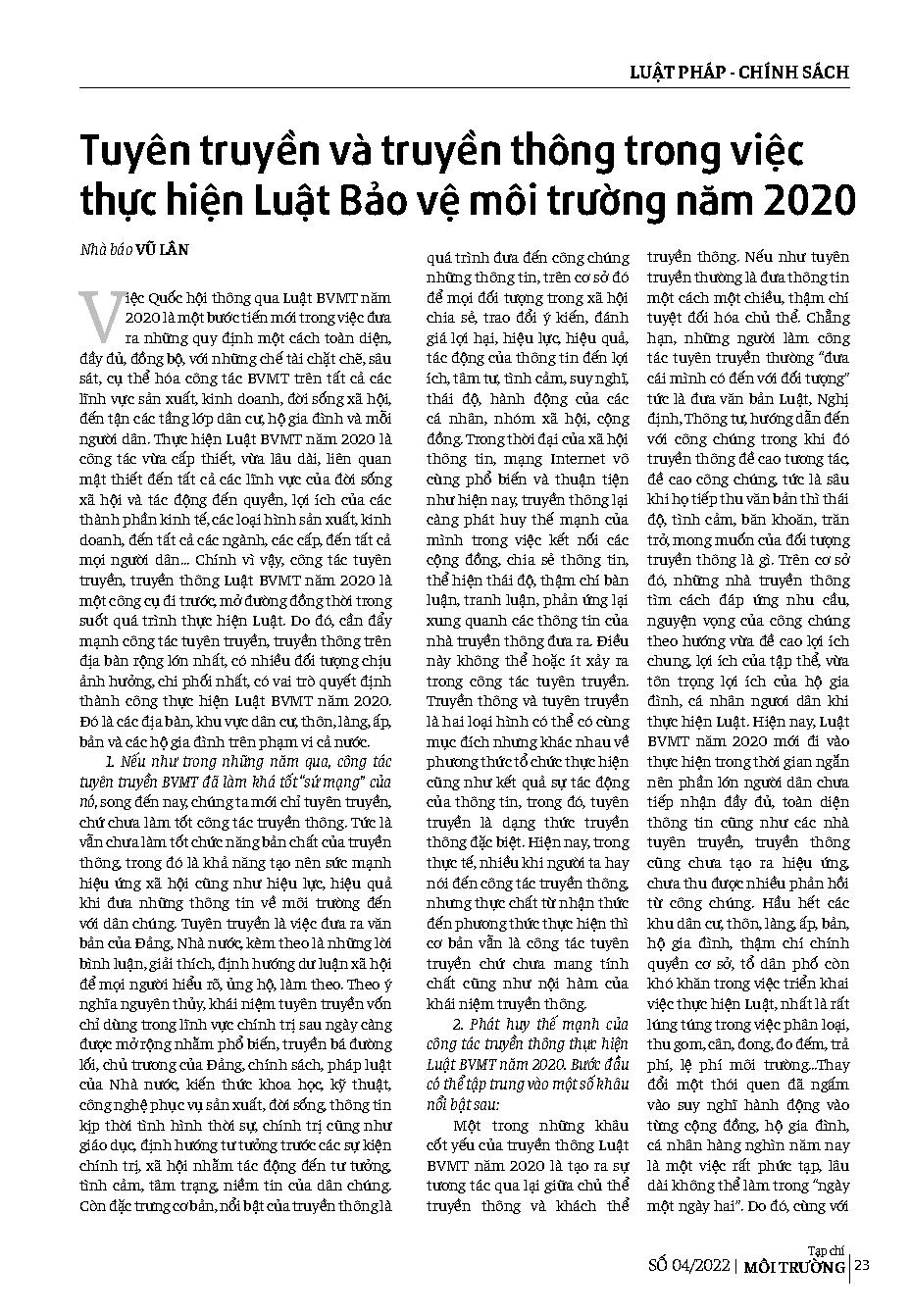 Tuyên truyền và truyền thông trong việc thực hiện Luật Bảo vệ môi trường năm 2020