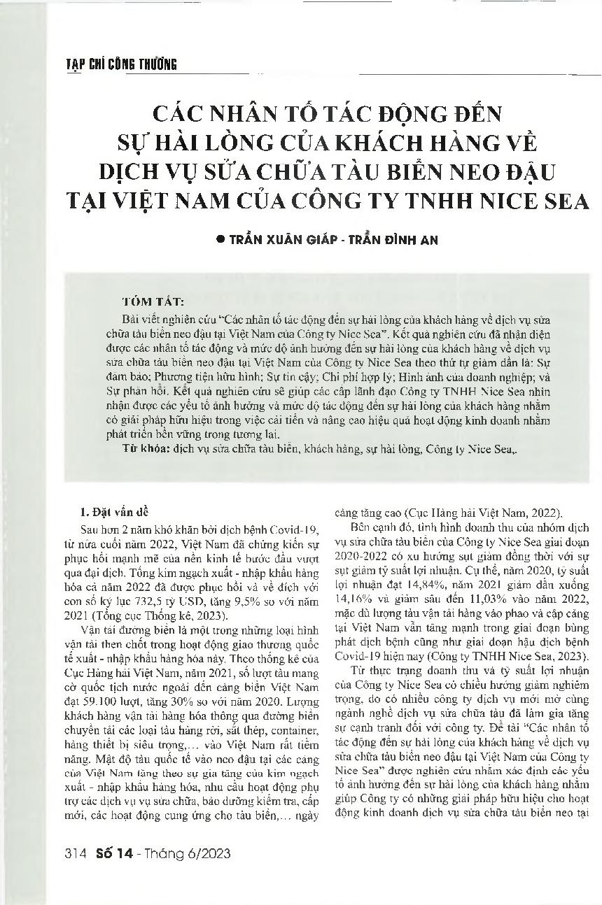 Các nhân tố tác động đến sự hài lòng của khách hàng về dịch vụ sửa chữa tàu biển neo đậu tại Việt Nam của Công ty TNHH Nice Sea