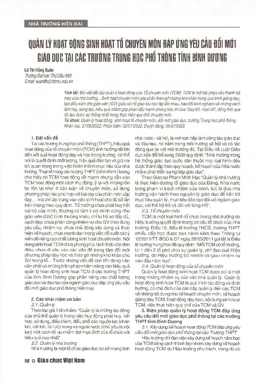 Quản lý hoạt động sinh hoạt tổ chuyên môn đáp ứng yêu cầu đổi mới giáo dục tại các trường trung học phổ thông tỉnh Bình Dương