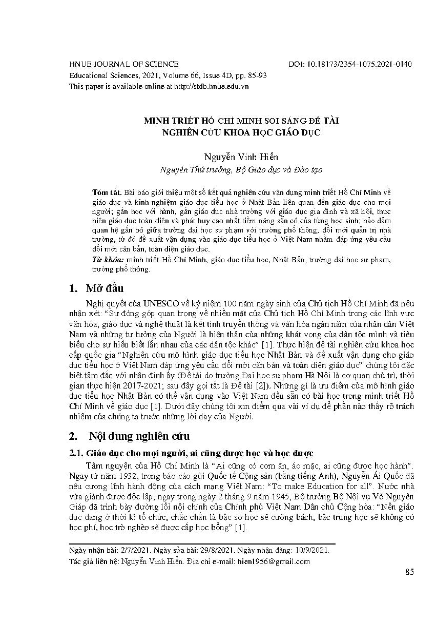 Minh triết Hồ Chí Minh soi sáng đề tài nghiên cứu khoa học giáo dục = The wisdom of Ho Chi Minh illuminates research in to education sciences