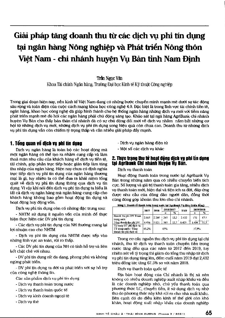 Giải pháp tăng doanh thu từ các dịch vụ phi tín dụng tại ngân hàng Nông nghiệp và Phát triển Nông thôn Việt Nam - chi nhánh huyện Vụ Bản tỉnh Nam Định