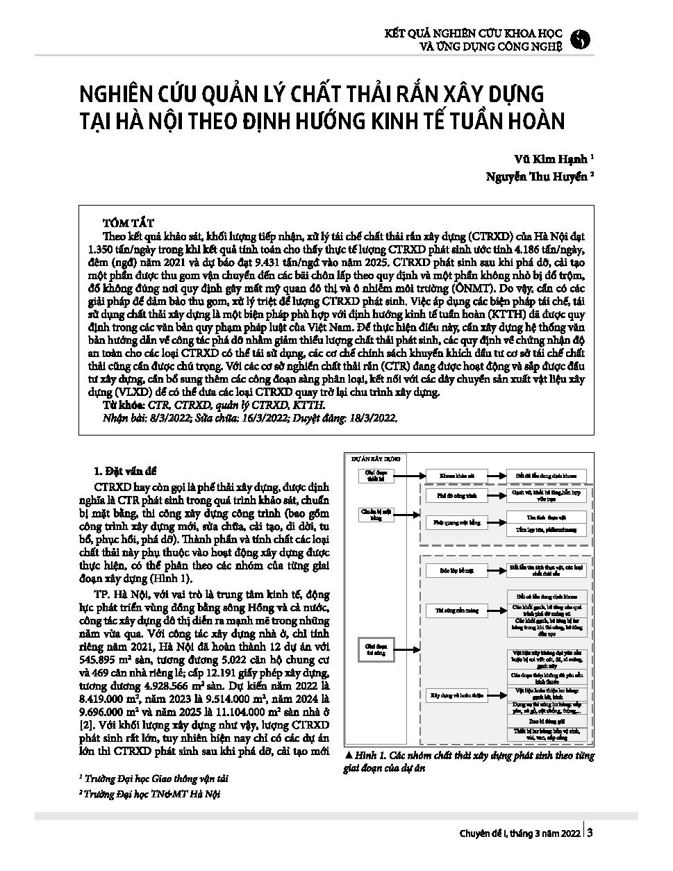 Nghiên cứu quản lý chất thải rắn xây dựng tại Hà Nội theo định hướng kinh tế tuần hoàn = Research on construction solid waste management in Hanoi in the direction of circular economy