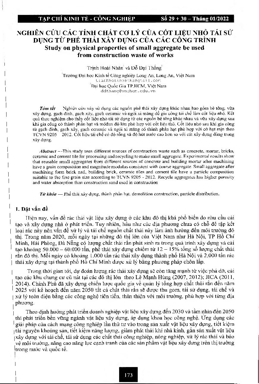 Nghiên cứu các tính chất cơ lý của cốt liệu nhỏ tái sử dụng từ phế thải xây dựng của các công trình = Study on physical properties of small aggregate be used from construction waste of works