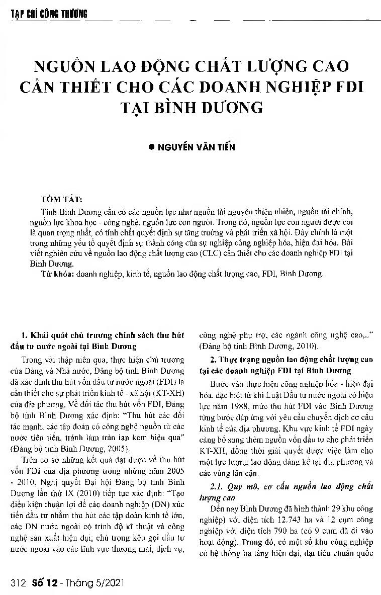 Nguồn lao động chất lượng cao cần thiết cho các doanh nghiệp FDI tại Bình Dương = The need of FDI enterprises in Binh Duong Province for high-quality labor resources