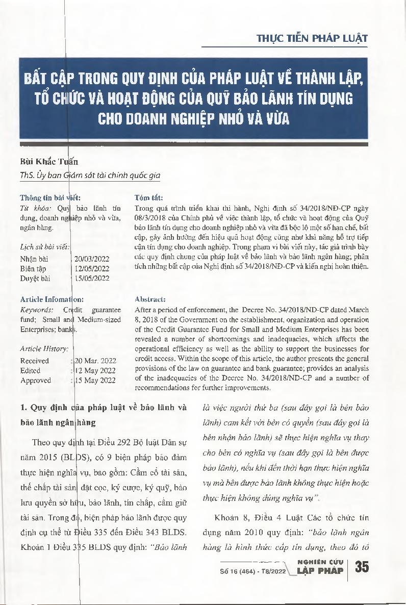 Bất cập trong quy định của pháp luật về thành lập, tổ chức và hoạt động của quỹ bảo lãnh tín dụng cho doanh nghiệp nhỏ và vừa = Inadequacies in the provisions of law on the establishment, organization and operation of credit guarantee funds for small and