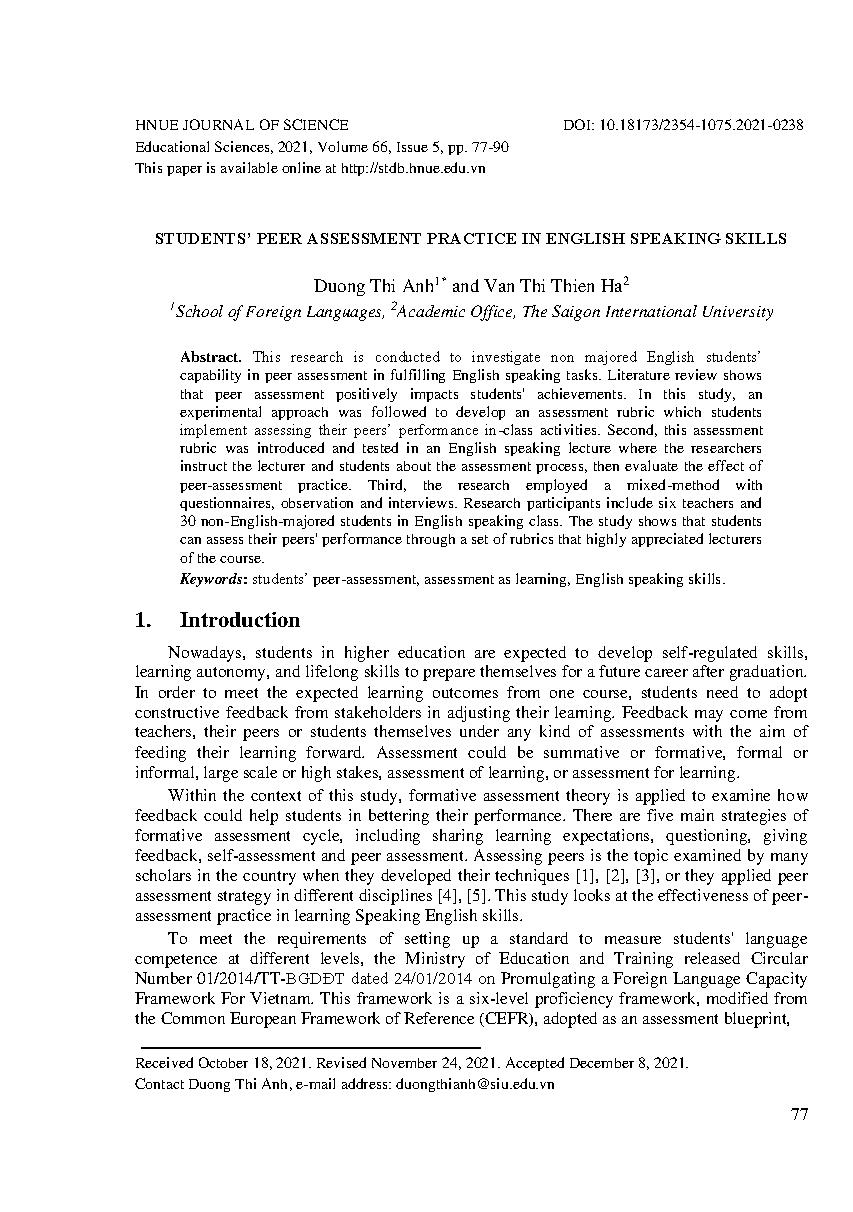 Thực hành đánh giá đồng nghiệp của học sinh về kỹ năng nói tiếng Anh = Students’ peer assessment practice in english speaking skills