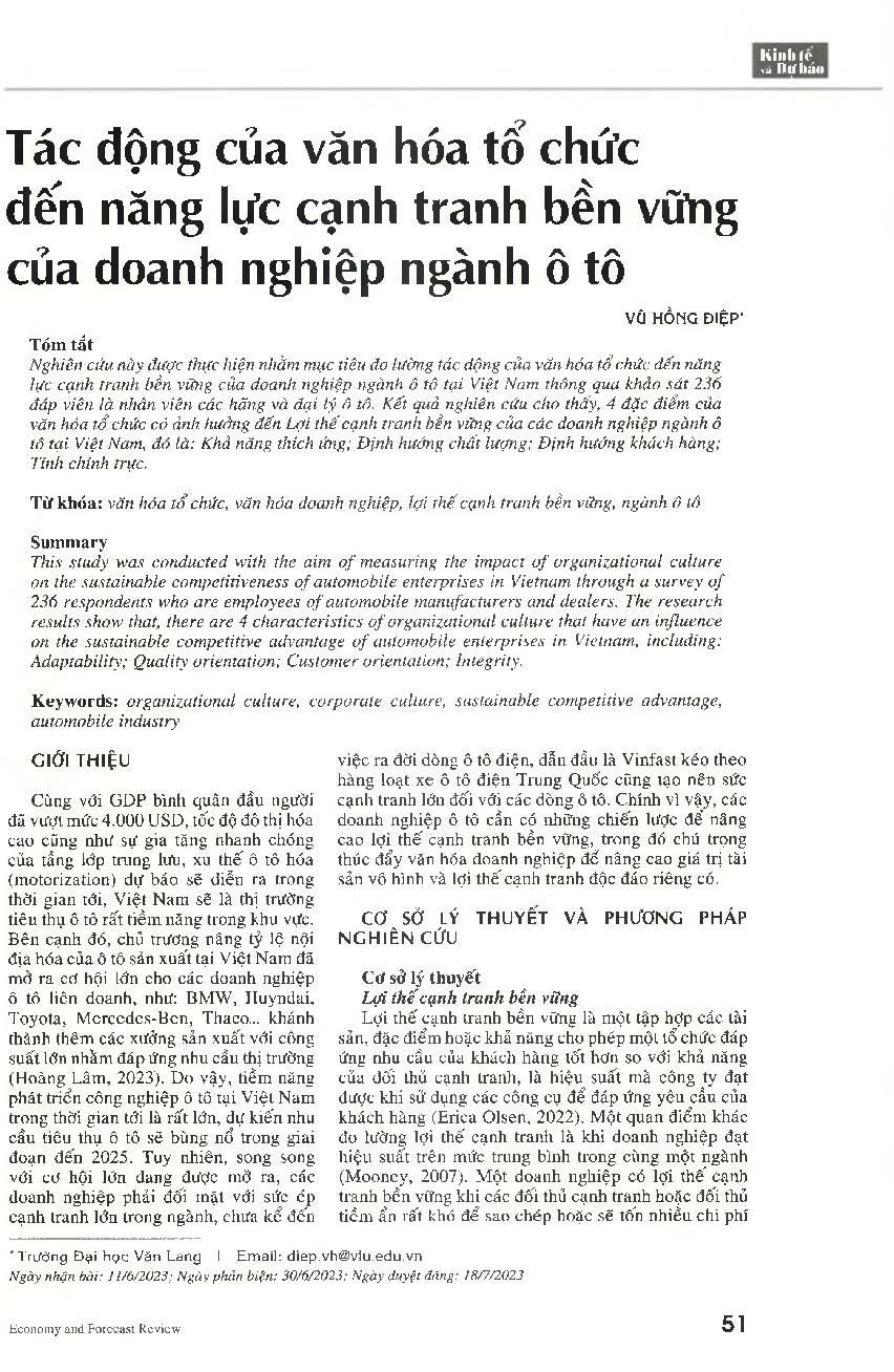 Tác động của văn hóa tổ chức đến năng lực cạnh tranh bền vững của doanh nghiệp ngành ô tô
