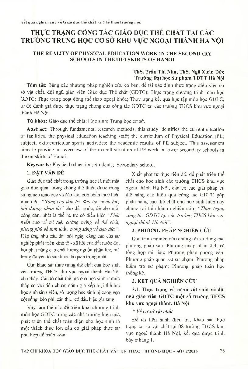 Thực trạng công tác giáo dục thể chất tại các trường trung học cơ sở khu vực ngoại thành Hà Nội
