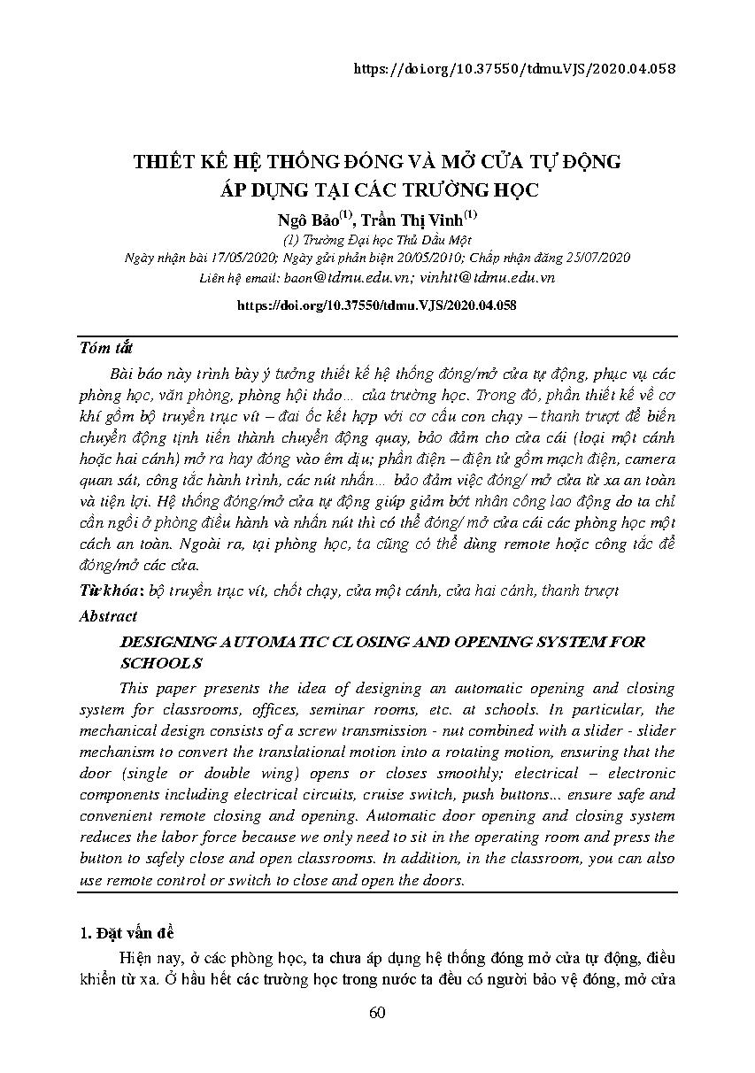THIẾT KẾ HỆ THỐNG ĐÓNG VÀ MỞ CỬA TỰ ĐỘNG ÁP DỤNG TẠI CÁC TRƯỜNG HỌC = DESIGNING AUTOMATIC CLOSING AND OPENING SYSTEM FOR SCHOOLS