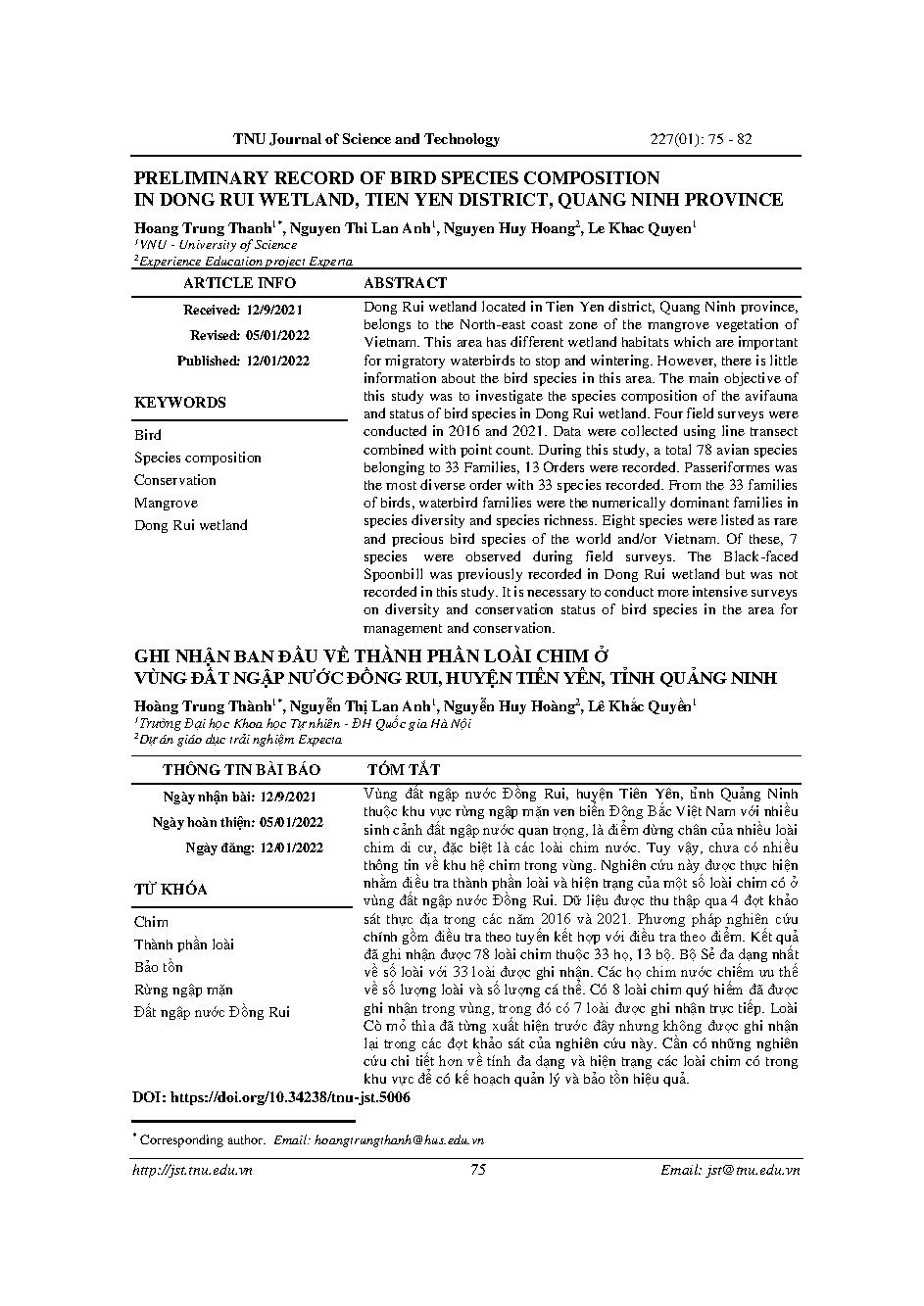 Ghi nhận ban đầu về thành phần loài chim ở vùng đất ngập nước Đồng Rui, huyện Tiên Yên, tỉnh Quảng Ninh = Preliminary record of bird species composition in Dong Rui wetland, Tien Yen district, Quang Ninh province