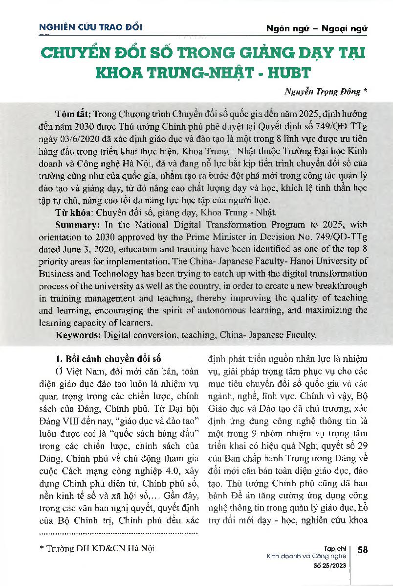 Chuyển đổi số trong giảng dạy tại khoa Trung-Nhật Trường Đại học Kinh doanh và Công nghệ Hà Nội = Digital transformation in teaching at the Chinese - Japanese Faculty, Hanoi University of Business and Technology