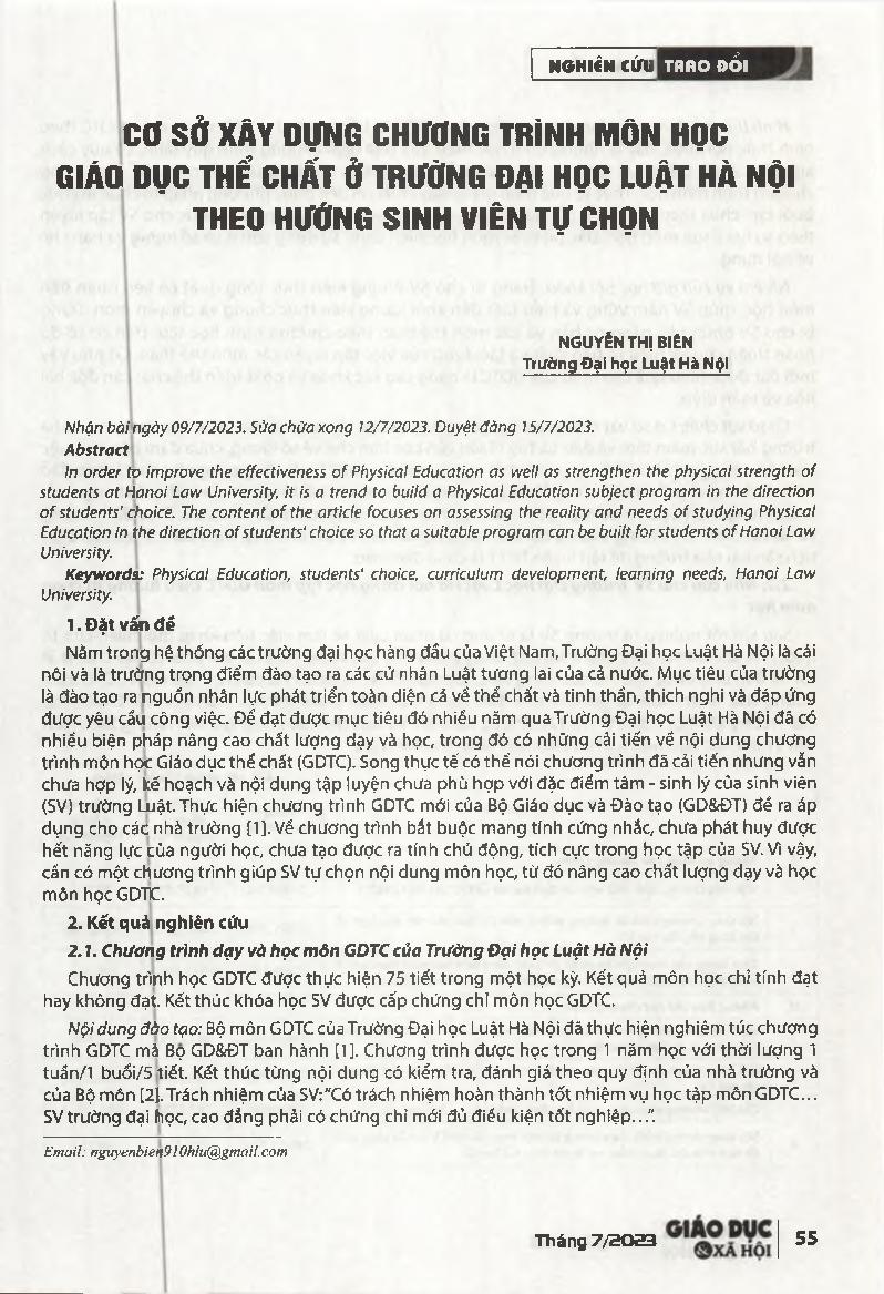 Cơ sở xây dựng chương trình môn học Giáo dục thề chất ở Trường Đại học Luật Hà Nội theo hướng sinh viên tự chọn = Building Physical Education program at Hanoi Law University in the direction of students) choice.