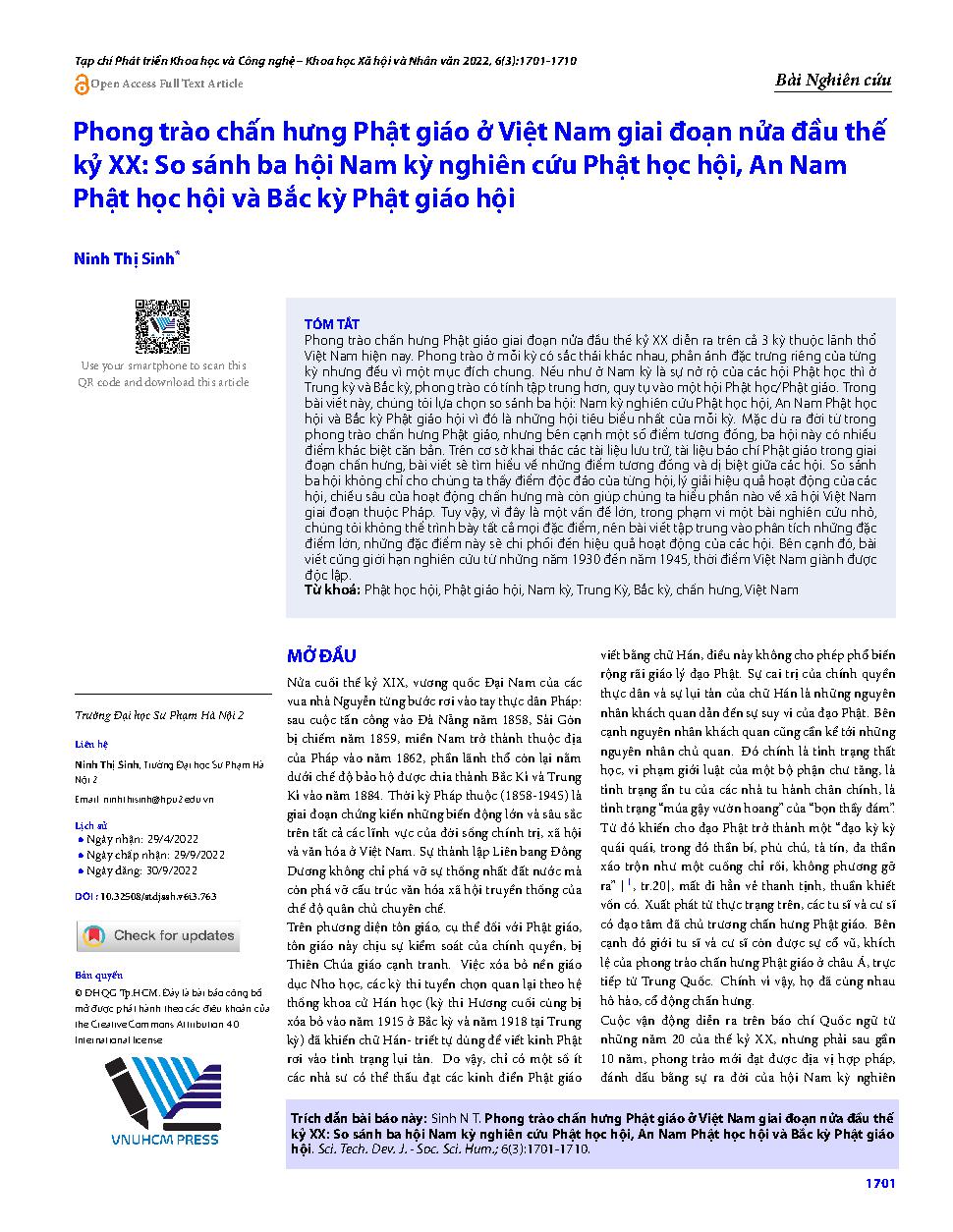 Phong trào chấn hưng Phật giáo ở Việt Nam giai đoạn nửa đầu thế kỷ XX: So sánh ba hội Nam kỳ nghiên cứu Phật học hội, An Nam Phật học hội và Bắc kỳ Phật giáo hội = The Vietnamese Buddhist revival movement in the first half of the twentieth century: compar