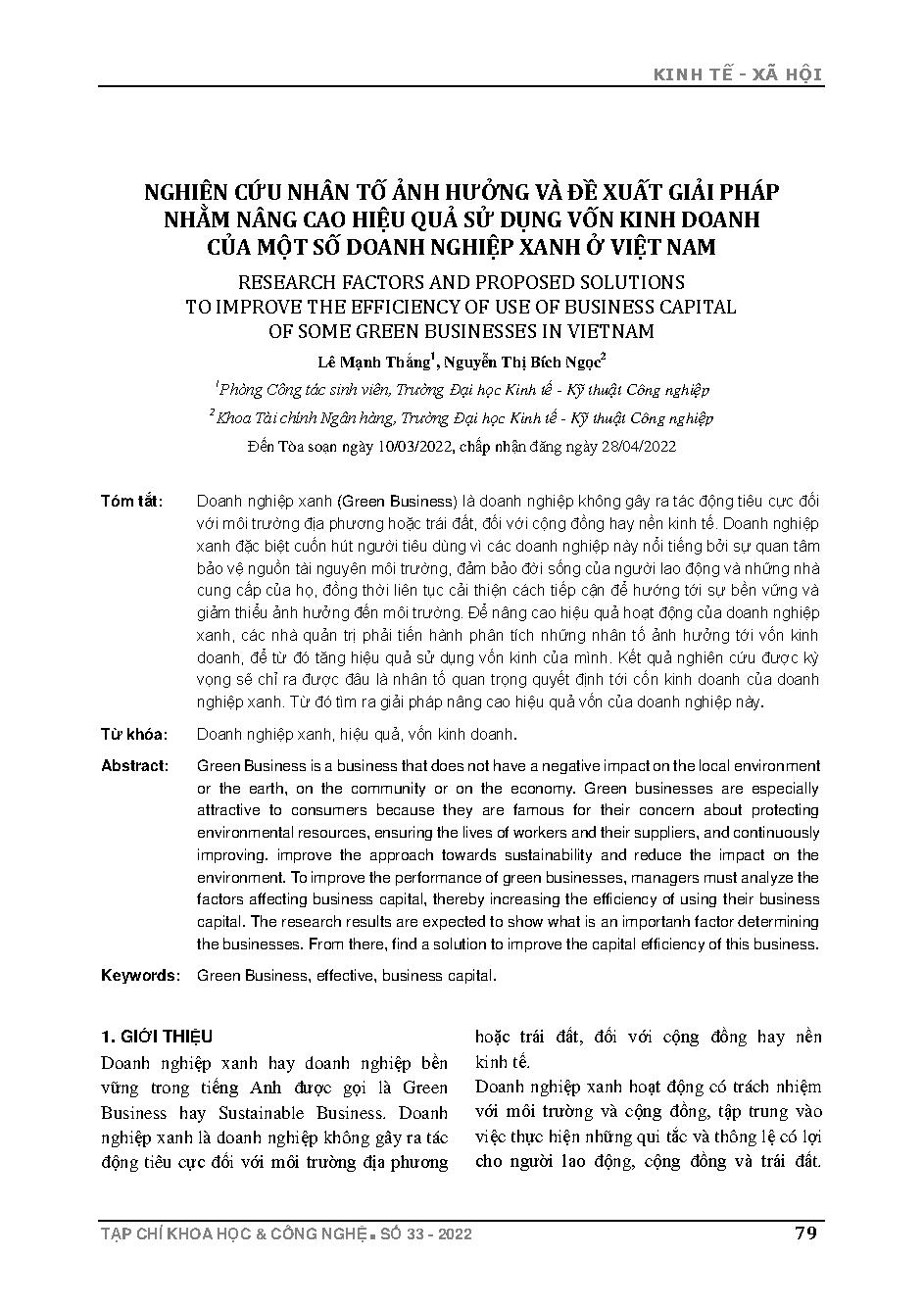 Nghiên cứu nhân tố ảnh hưởng và đề xuất giải pháp nhằm nâng cao hiệu quả sử dụng vốn kinh doanh của một số doanh nghiệp xanh ở Việt Nam = Research factors and proposed solutions to improve the efficiency of use of business capital of some green businesses