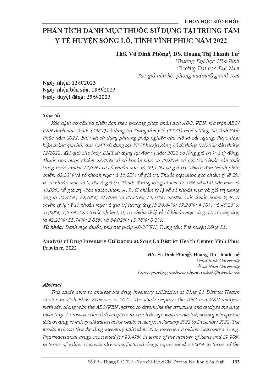 Phân tích danh mục thuốc sử dụng tại Trung tâm Y tế huyện Sông Lô, tỉnh Vĩnh Phúc năm 2022 = Analysis of drug inventory utilization at Song Lo district Health Center, Vinh Phuc province, 2022