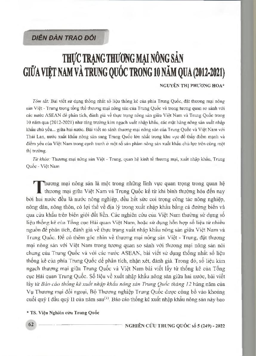 Thực trạng thương mại nông sản giữa Việt Nam và Trung Quốc trong 10 năm qua(2012-2021) = Current situation of trade in agricultural products between Vietnam and China in the last 10 years (2012-2021)