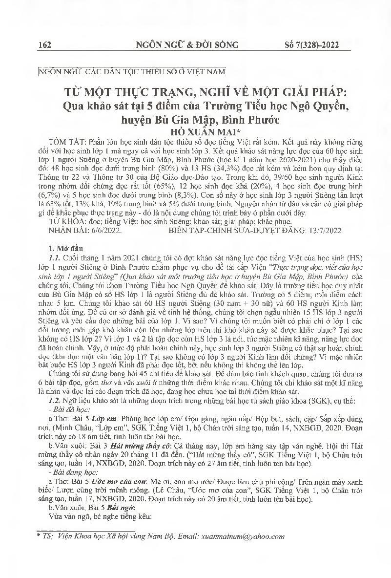 Từ một thực trạng, nghĩ về một giải pháp: Qua khảo sát tại 5 điểm của Trường Tiểu học Ngô Quyền, huyện Bù Gia Mập, Bình Phước = Thinking about a solution from reality: by surveyed at 5 branches of Ngô Quyền Primary school, Bù Gia Mập province, Bình Phước