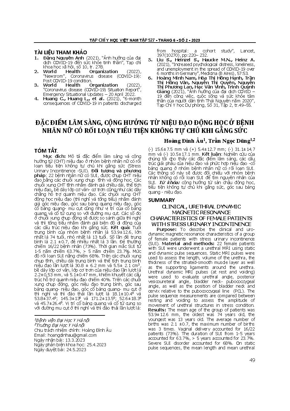 Đặc điểm lâm sàng, cộng hưởng từ niệu đạo động học ở bệnh nhân nữ có rối loạn tiểu tiện không tự chủ khi gắng sức = Clinical, urethral dynamic magnetic resonance characteristics of female patients with stress urinary incontinence