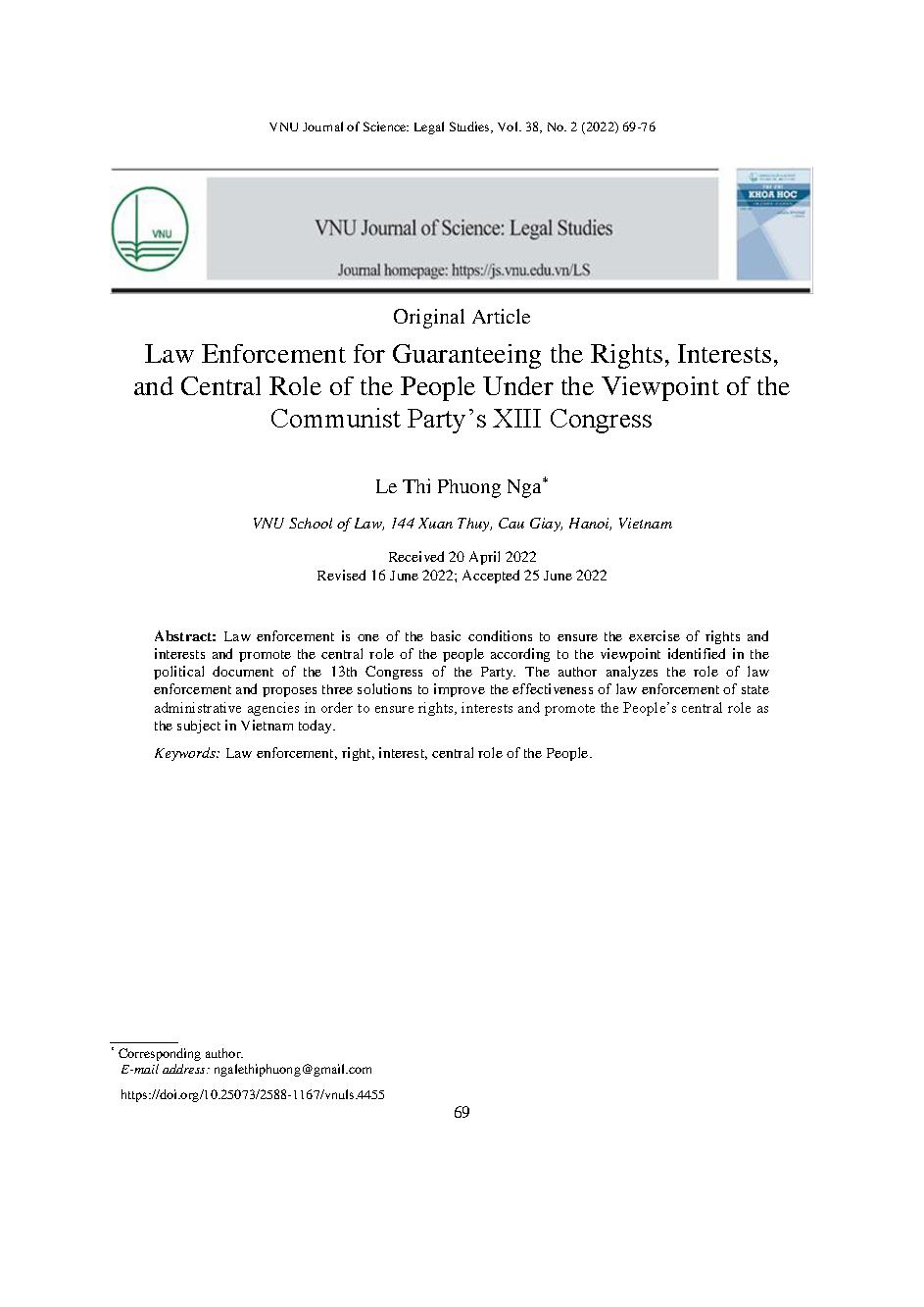 Tổ chức thi hành pháp luật đảm bảo quyền, lợi ích, vai trò chủ thể, vị trí trung tâm của nhân dân theo quan điểm Đại hội XIII của Đảng = Law enforcement for guaranteeing the rights, interests, and central role of the people under the viewpoint of the Comm