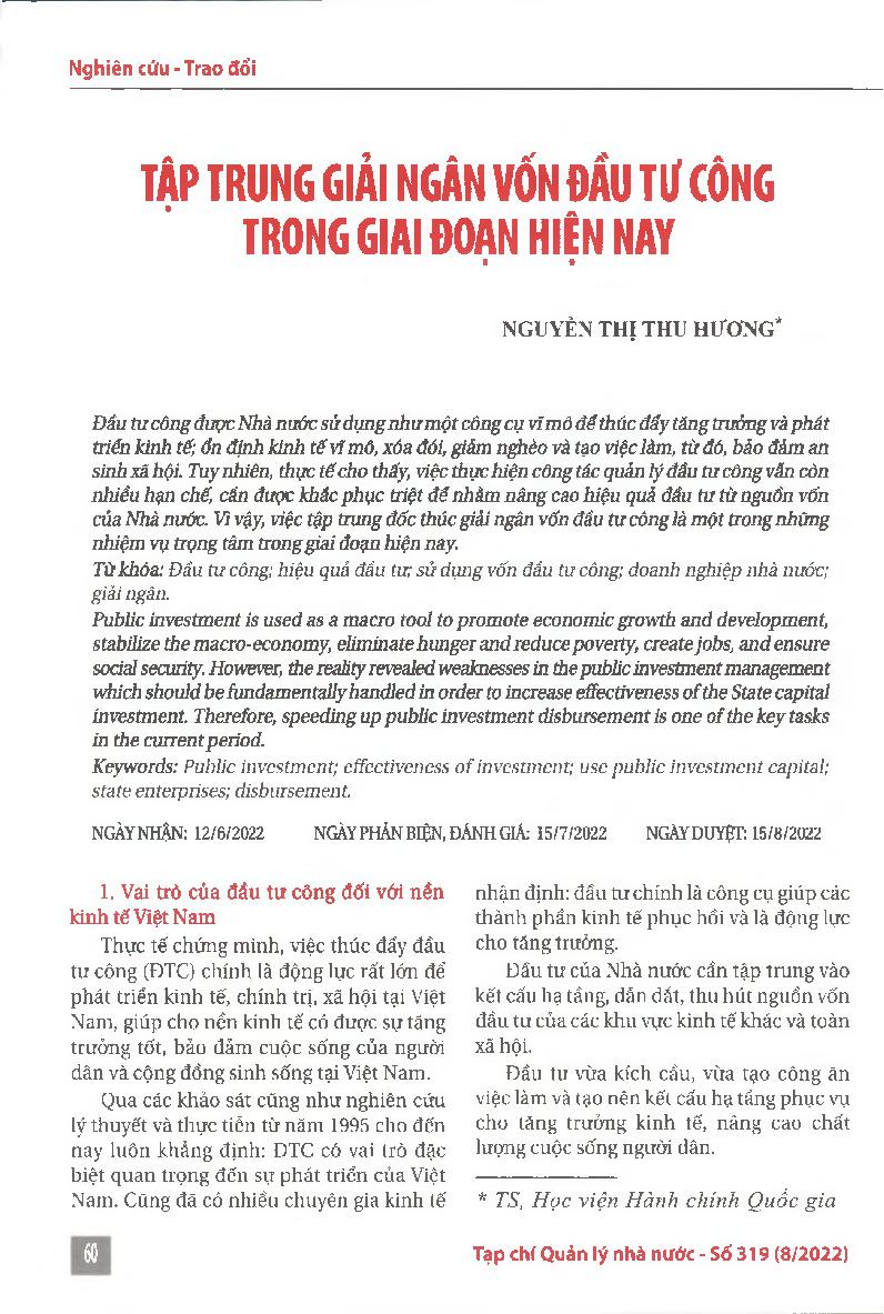 Tập trung giải ngân vốn đầu tư công trong giai đoạn hiện nay = Speeding up public investment disbursement in the current period