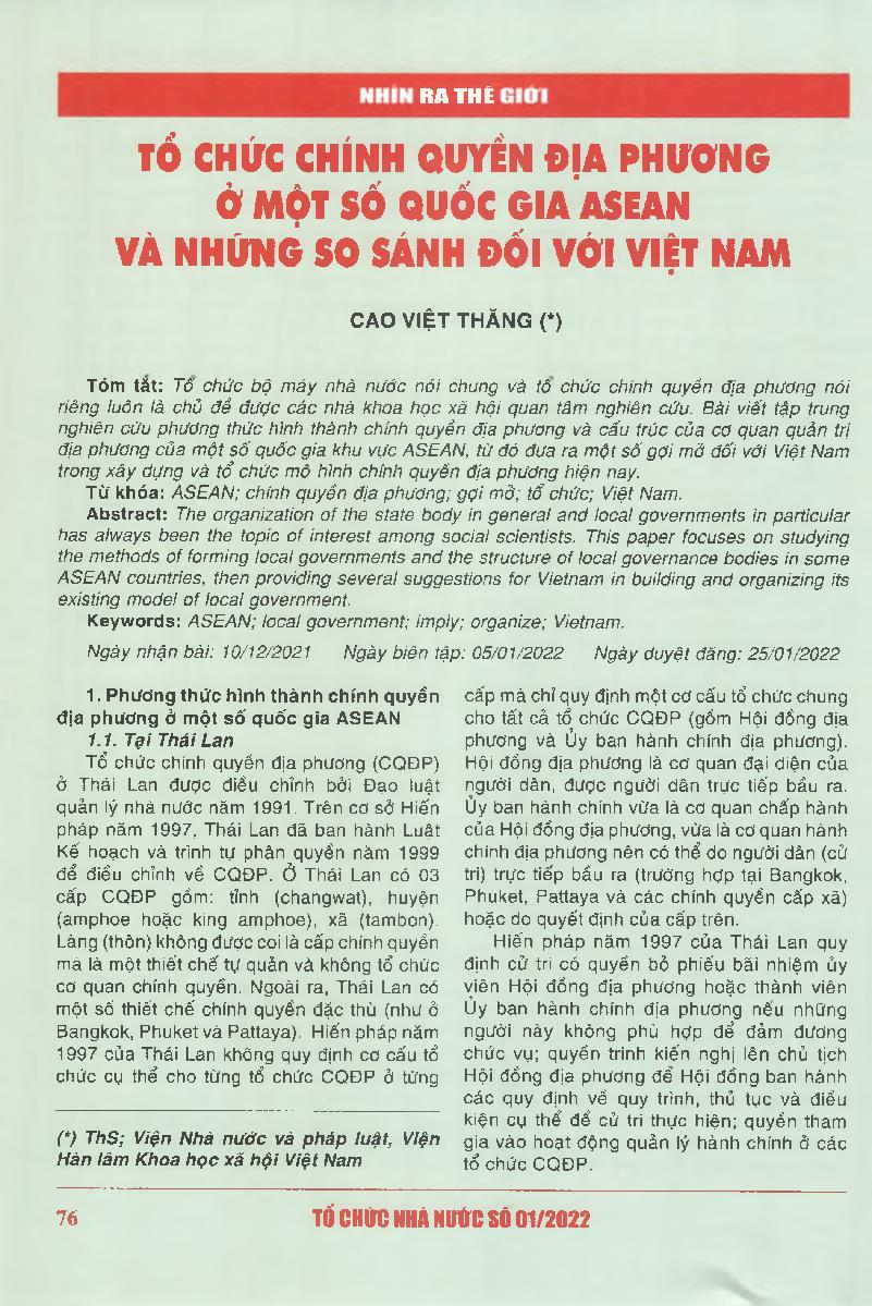 Tổ chức chính quyền địa phương ở một số quốc gia ASEAN và những so sánh đối với Việt Nam = The organization of local governments in some ASEAN countries and comparisons with Vietnam