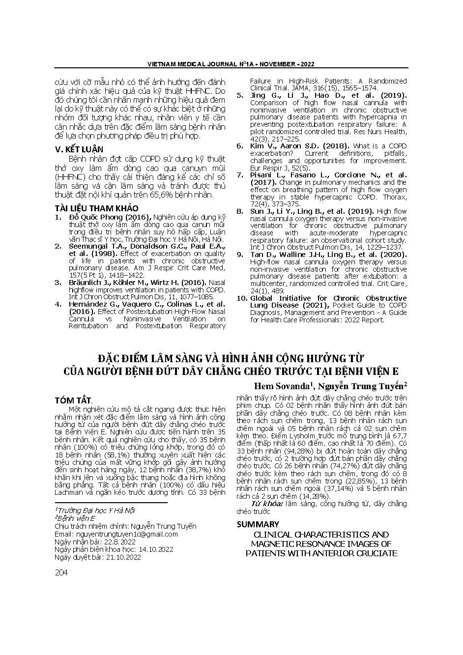 Đặc điểm lâm sàng và hình ảnh cộng hưởng từ của người bệnh đứt dây chằng chéo trước tại Bệnh viện E = Clinical characteristics and magnetic resonance images of patients with anterior cruciate ligament rupture at the E hospital